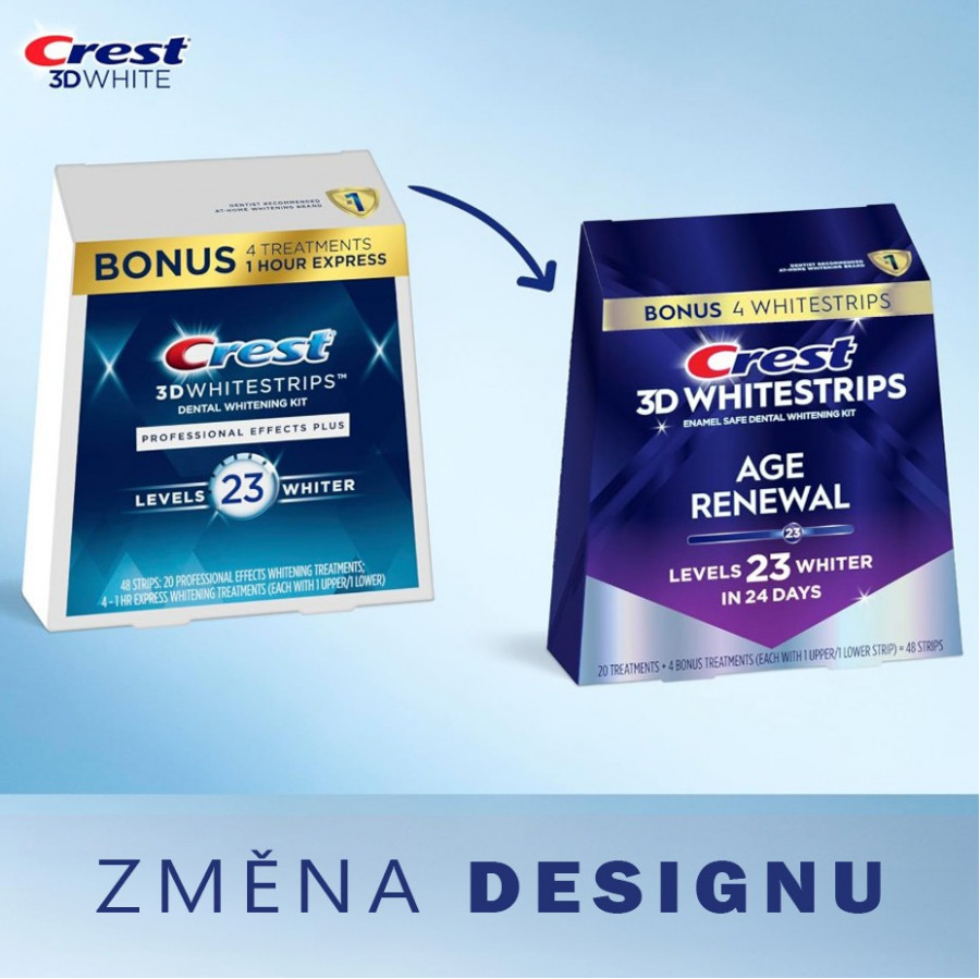 Bonusové balení bělících pásků Crest 3D Whitestrips AGE RENEWAL se 4 aplikacemi pásků navíc.