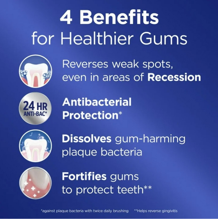 Nejnovější zubní pasta Crest Pro-Health GUM RECESSION je vyvinuta speciálně pro záchranu dásní i v oblastech s jejich ústupem (recesí). Slabá místa na dásních mohou být bolestivá a omezovat správné čištění či používání zubní nitě. Jemná, zklidňující formule Gum Rescue posiluje dásně, snižuje krvácení a zánět a zároveň chrání před dalším poškozením.